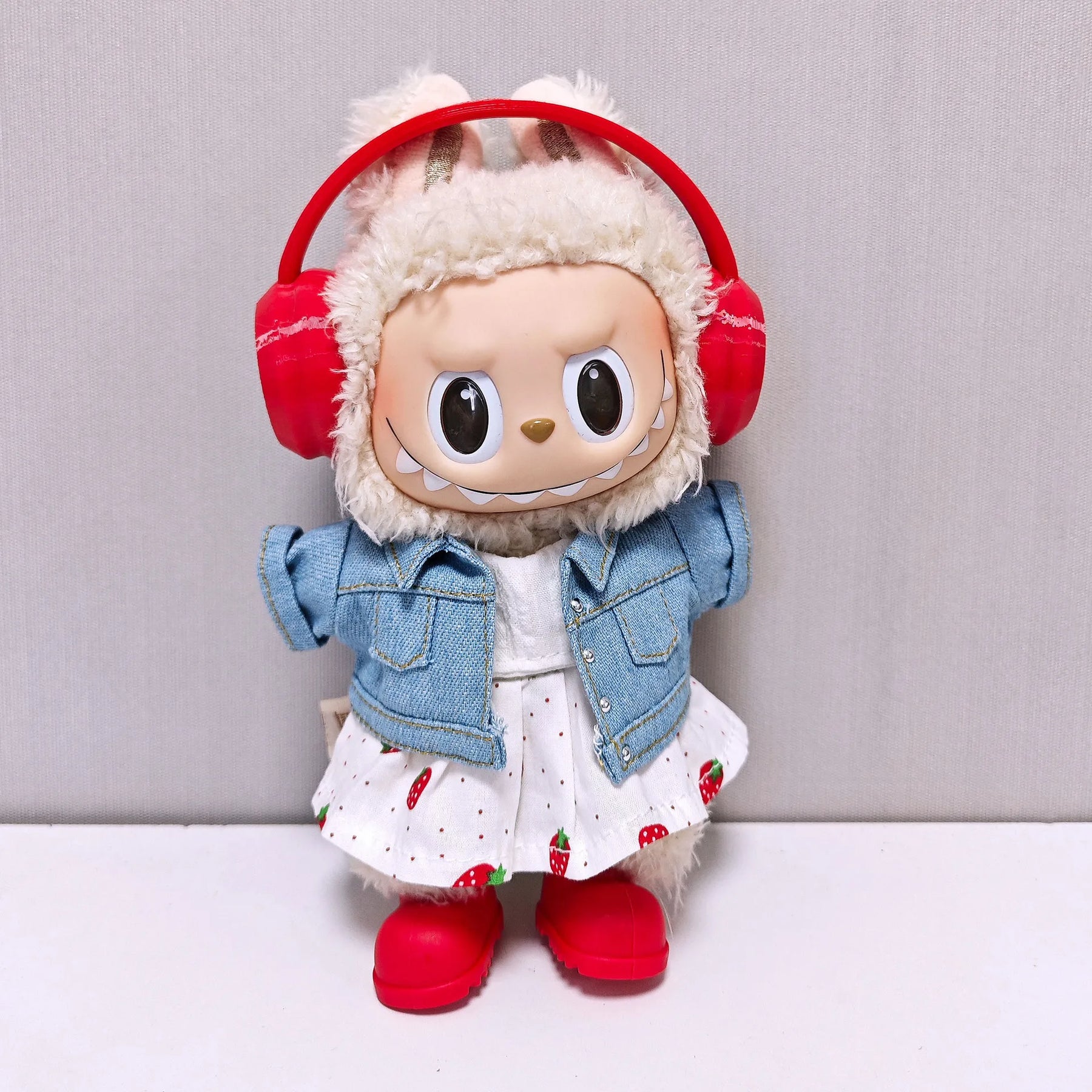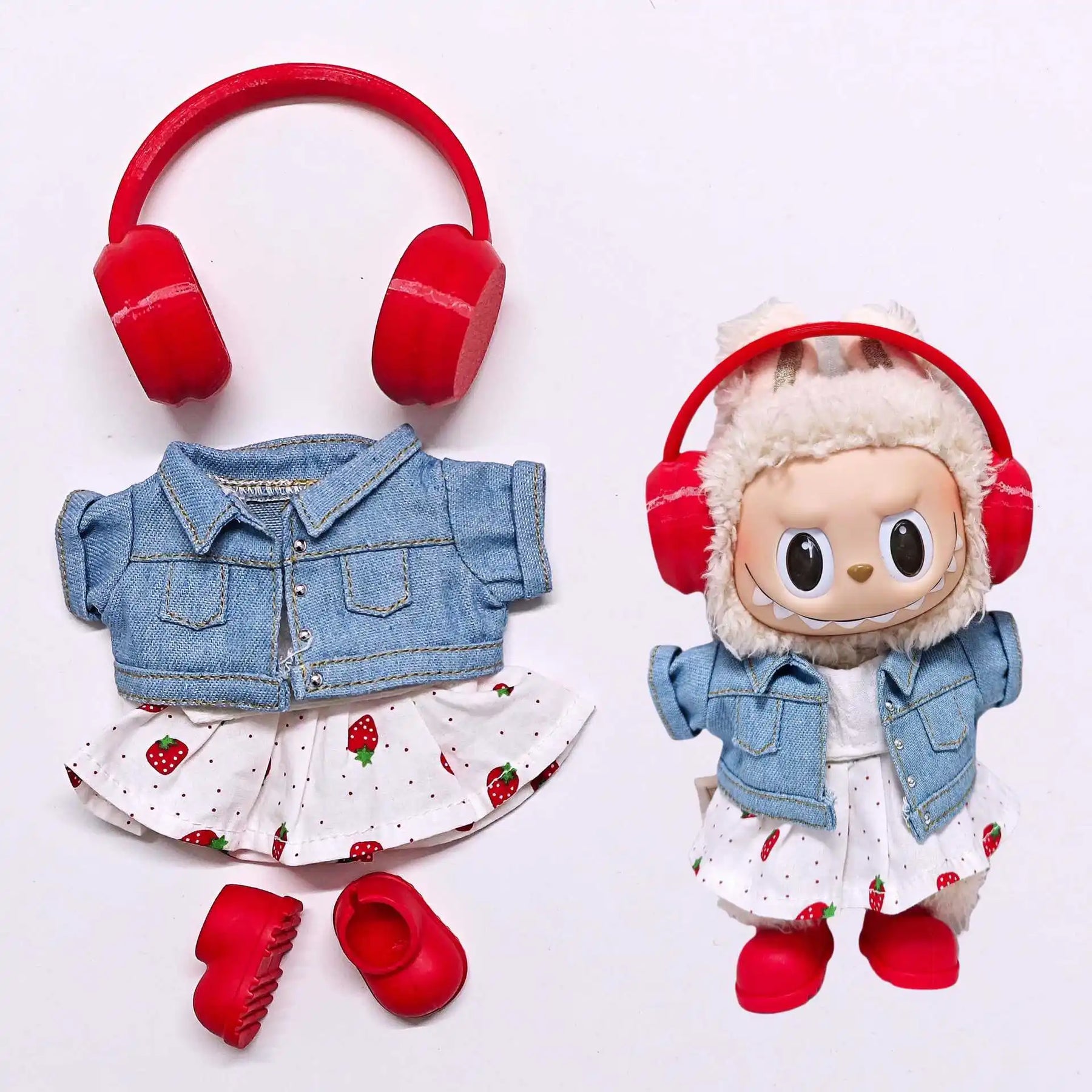 Labubu Doll Clothes Set Strawberry Dress Denim Jacket Colorful Headphones & Shoes Cute Plush Outfits for 1-3 Gen